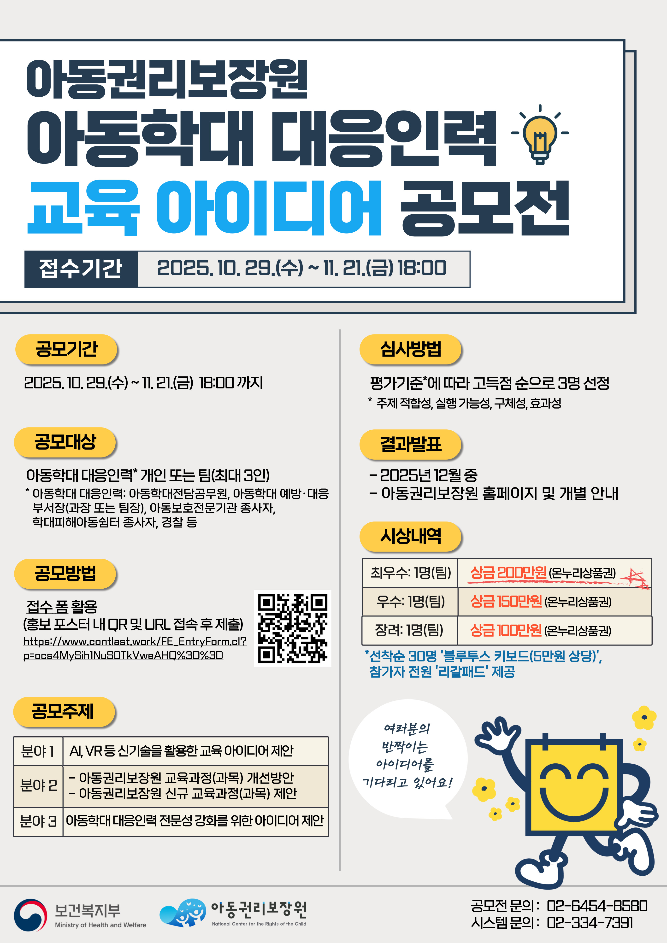 - 공모전 관련: 아동권리보장원 교육총괄팀(02-6454-8580)