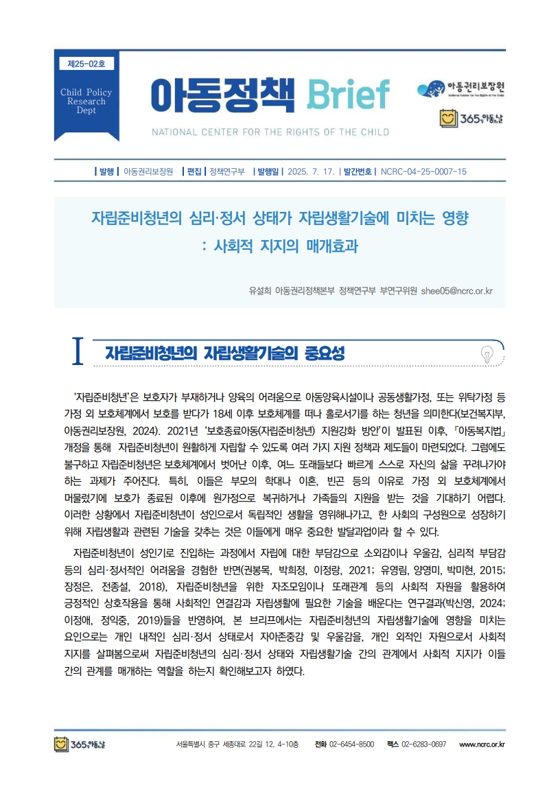 [아동정책Brief] (제25-02호) 자립준비청년의 심리· 정서 상태가 자립생활기술에 미치는 영향