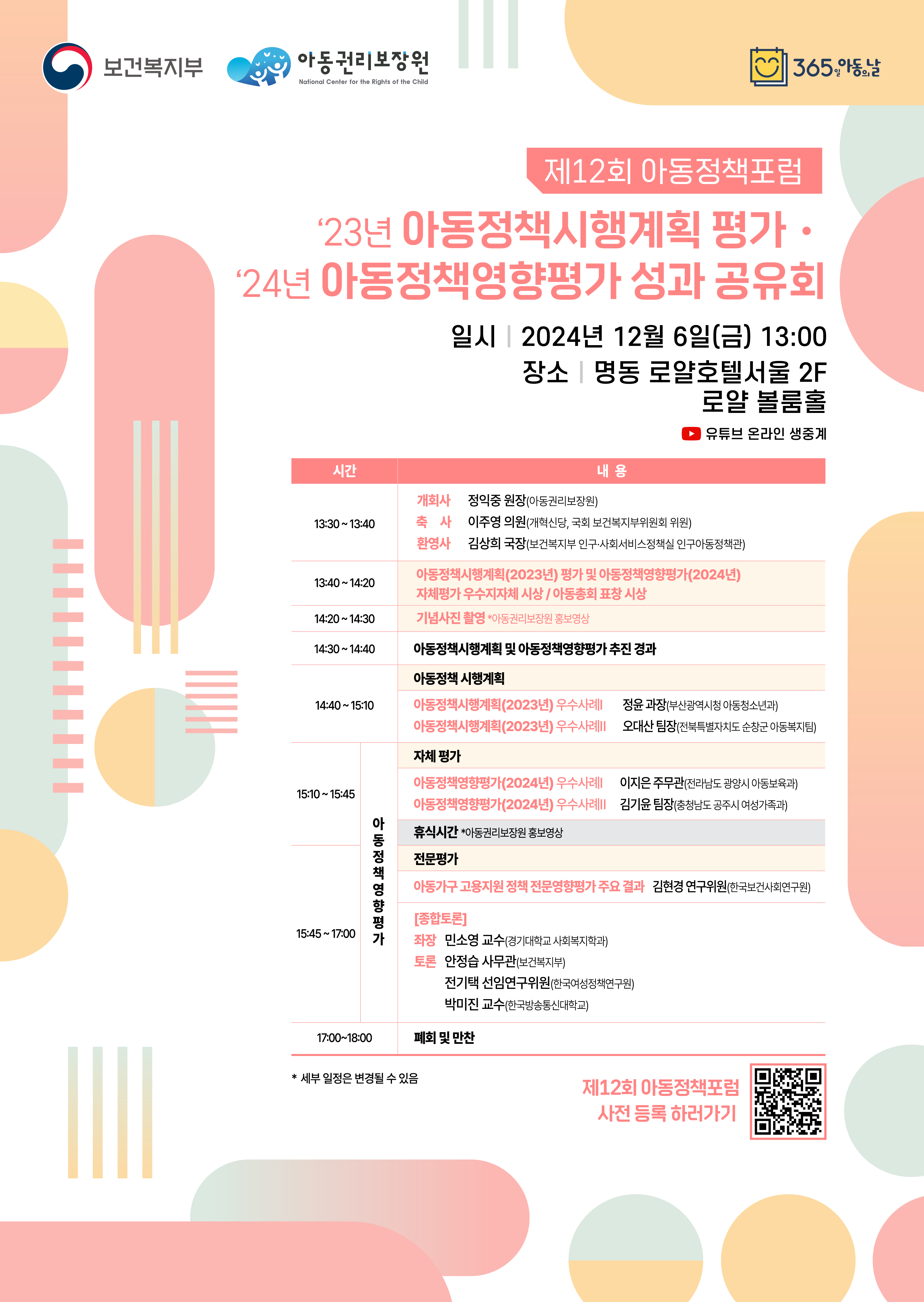 현장참석과 함께 2024년 12월 6일(금) 오후 13시 30분부터 아동권리보장원 유튜브 채널을 통해 생중계 진행 예정입니다.