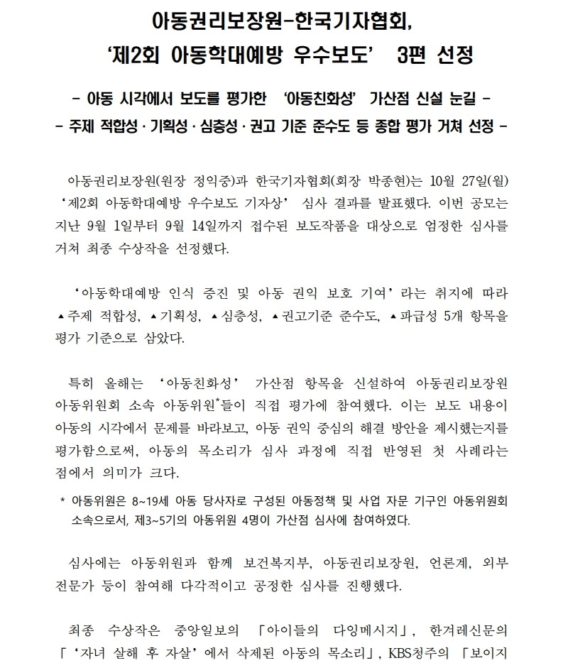 [보도자료, 10.27., 배포즉시] 아동권리보장원-한국기자협회, ‘제2회 아동학대예방 우수보도’ 3편 선정.hwp