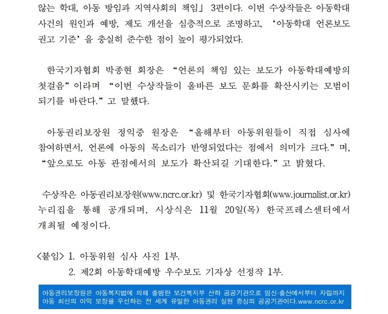 [보도자료] 아동권리보장원-한국기자협회, ‘제2회 아동학대예방 우수보도’ 3편 선정